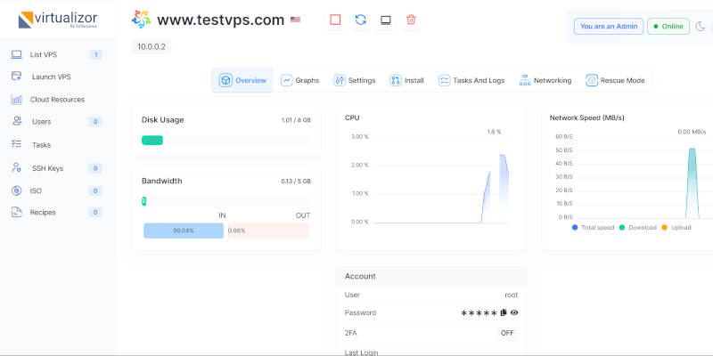 Virtualizor is our user-friendly VPS control panel. You can reboot the VPS, reinstall the operating system, set reverse DNS, upload an ISO image and more!
